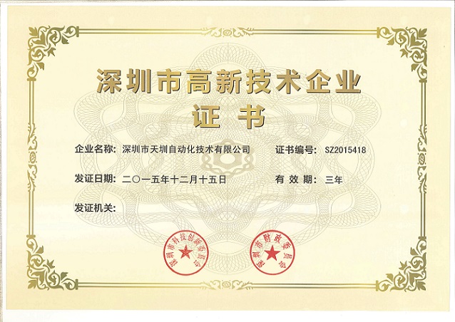 天圳公司于2015年8月底申報第二批深圳市高新技術企業認定,經過專家評審,于12月份獲評審通過。公司在知識產權、研究開發的組織管理水平、科技成果轉化能力、成長性指標等四項指標均達到了深圳市高新技術企業認定標準,現獲得《深圳市高新技術企業證書》。